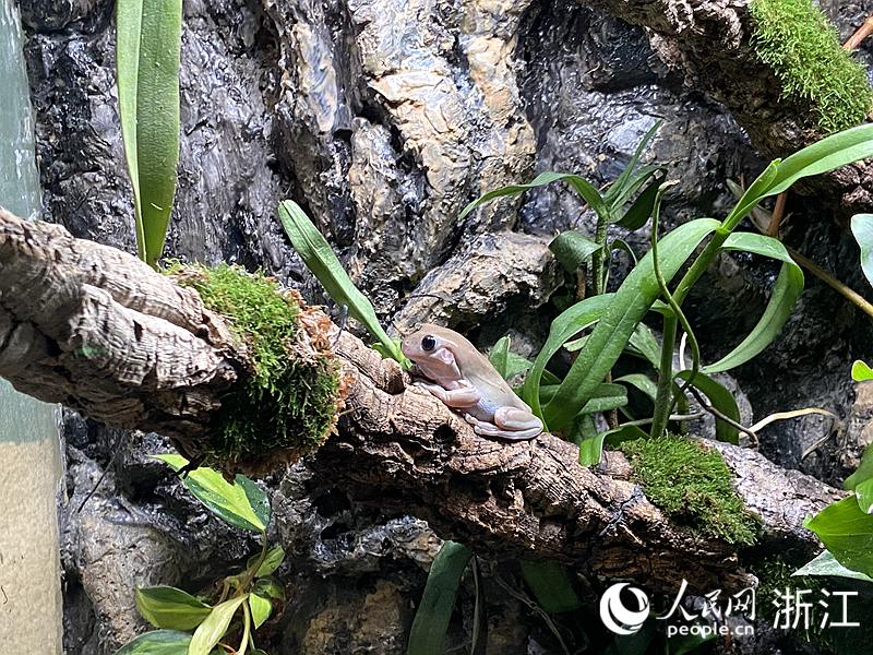 An Australian green tree frog is seen in an aquarium within the live reptile and amphibian display area at the National Wetland Museum of China. (People's Daily Online/Fang Pengyimeng)
