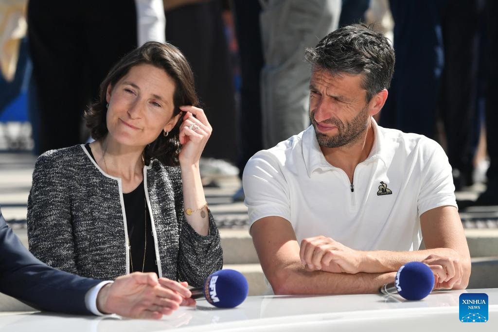French Sports Minister Amelie Oudea-Castera (L) and President of the Paris 2024 Olympics and Paralympics Organising Committee Tony Estanguet are seen in a TV interview during the relay of the Olympic flame of Paris 2024 in Marseille, France, May 9, 2024. (Photo by Julien Mattia/Xinhua)