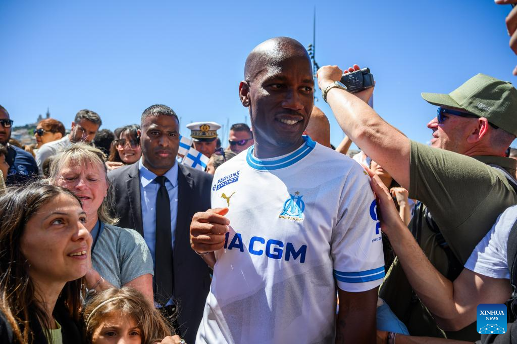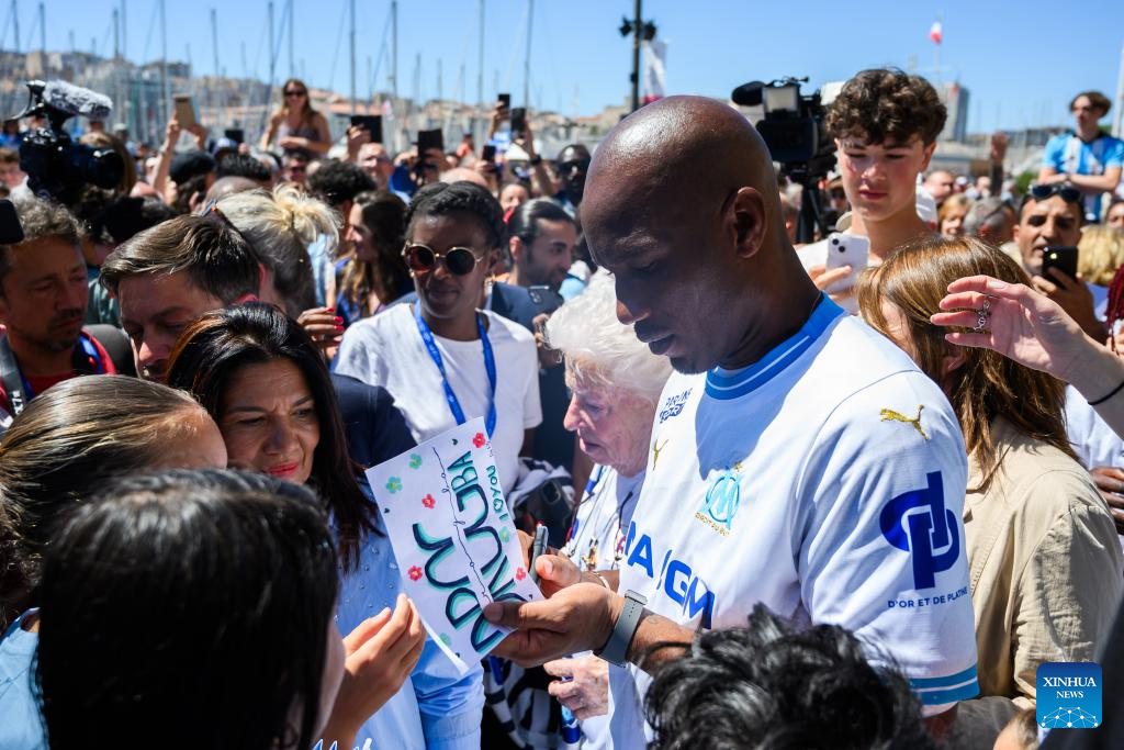 Former football player Didier Drogba signs for fans during the relay of the Olympic flame of Paris 2024 in Marseille, France, May 9, 2024. (Photo by Julien Mattia/Xinhua)