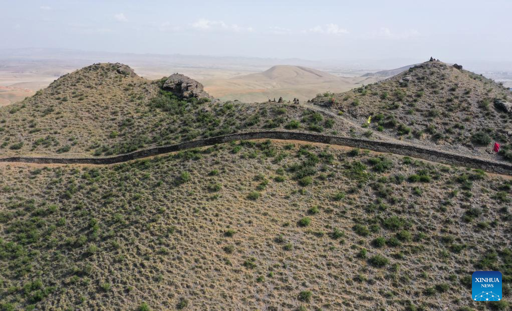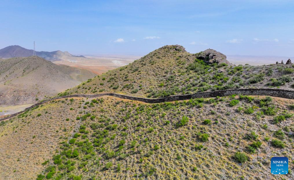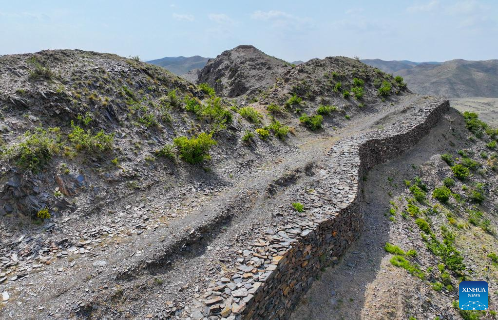 An aerial drone photo taken on May 9, 2024 shows the Kangtugou section of the Great Wall in Guyang County, north China's Inner Mongolia Autonomous Region. The Great Wall built in the Qin Dynasty (221 B.C.-207 B.C.) in Guyang County is well preserved thanks to its rock structure and the protection efforts made by local departments. (Xinhua/Li Zhipeng)