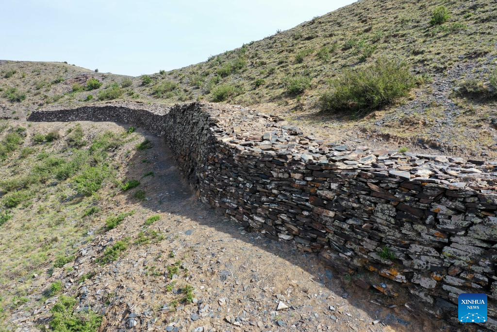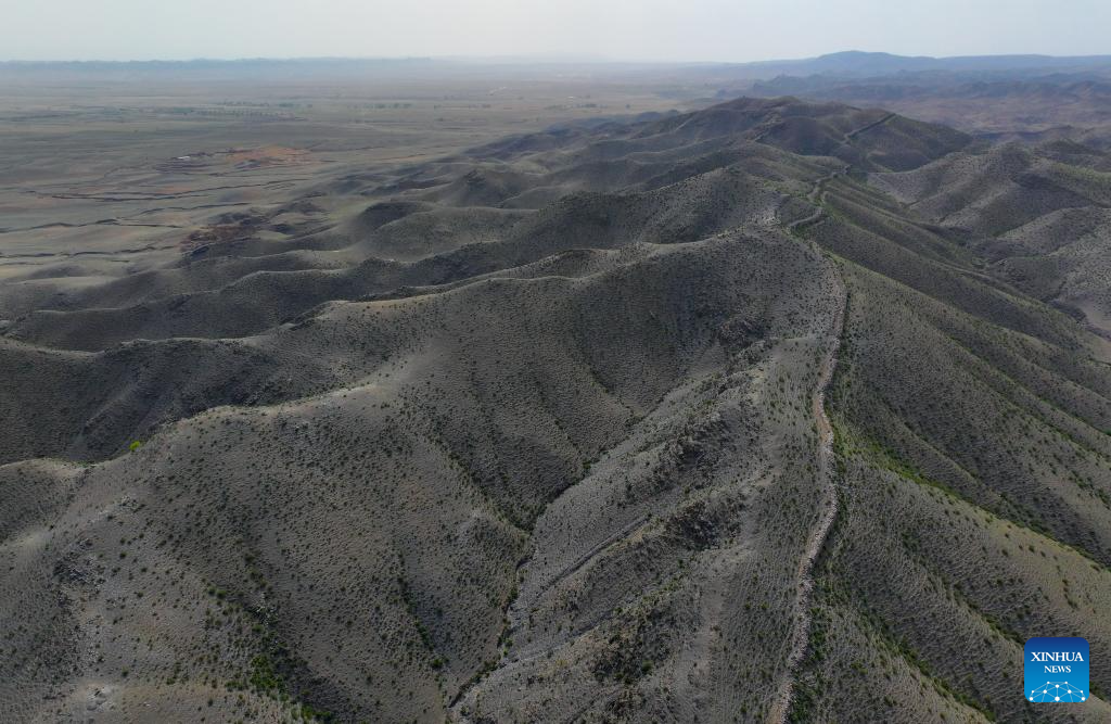 A drone photo taken on May 9, 2024 shows the Kangtugou section of the Great Wall in Guyang County, north China's Inner Mongolia Autonomous Region. The Great Wall built in the Qin Dynasty (221 B.C.-207 B.C.) in Guyang County is well preserved thanks to its rock structure and the protection efforts made by local departments. (Xinhua/Li Zhipeng)