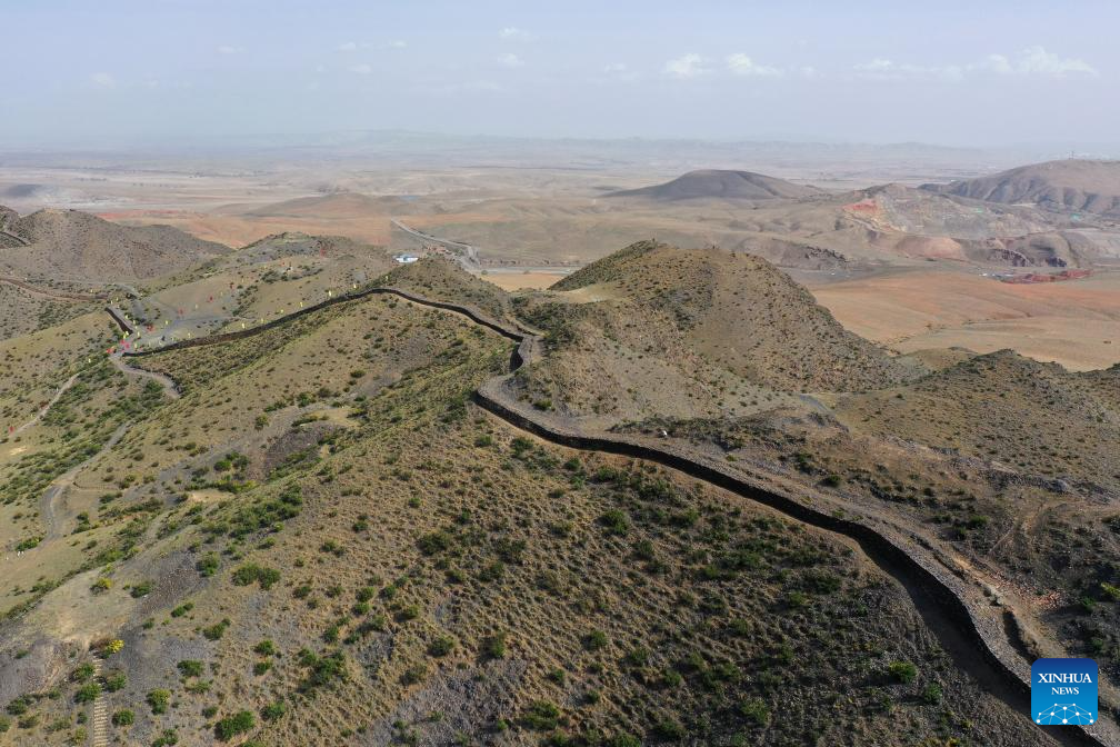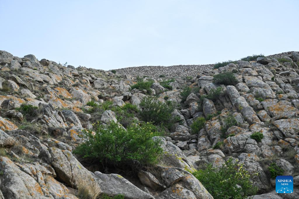 This photo taken on May 9, 2024 shows the Tianshengcheng section of the Great Wall in Guyang County, north China's Inner Mongolia Autonomous Region. The Great Wall built in the Qin Dynasty (221 B.C.-207 B.C.) in Guyang County is well preserved thanks to its rock structure and the protection efforts made by local departments. (Xinhua/Liu Lei)