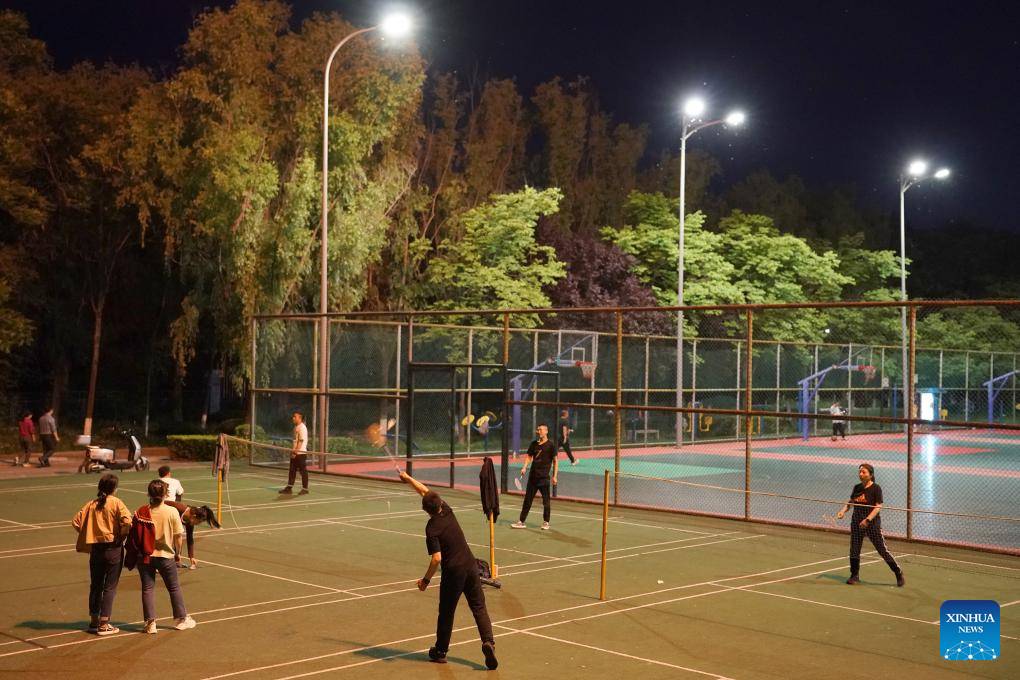 Citizens play badminton at a park in Baoji, northwest China's Shaanxi Province, May 9, 2024. Located at the foot of the Qinling Mountains and along the Weihe River, Baoji of northwest China's Shaanxi Province has continued to make efforts to create a livable urban environment. In recent years, a total of 36 small city parks have been built, providing citizens with activity space for leisure and sports, and improving the ecological environment of the city as well. (Xinhua/Shao Rui)