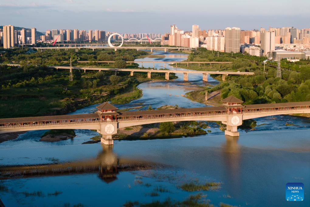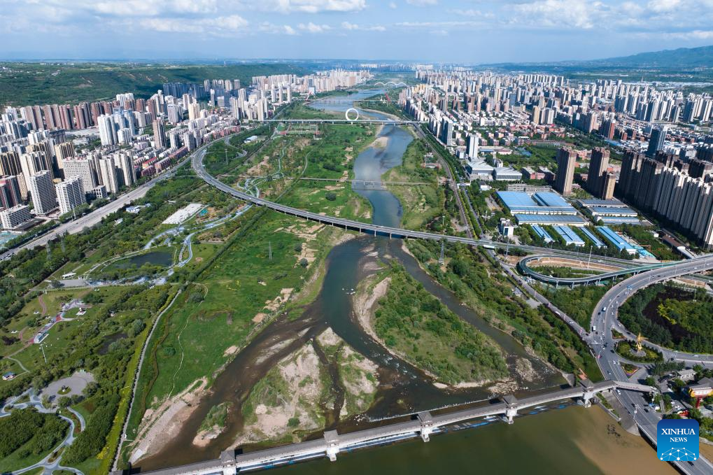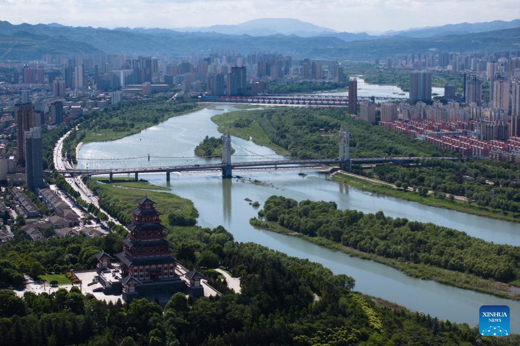An aerial drone photo taken on May 9, 2024 shows a city view along the Weihe River in Baoji, northwest China's Shaanxi Province. Located at the foot of the Qinling Mountains and along the Weihe River, Baoji of northwest China's Shaanxi Province has continued to make efforts to create a livable urban environment. In recent years, a total of 36 small city parks have been built, providing citizens with activity space for leisure and sports, and improving the ecological environment of the city as well. (Xinhua/Shao Rui)