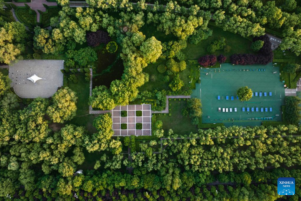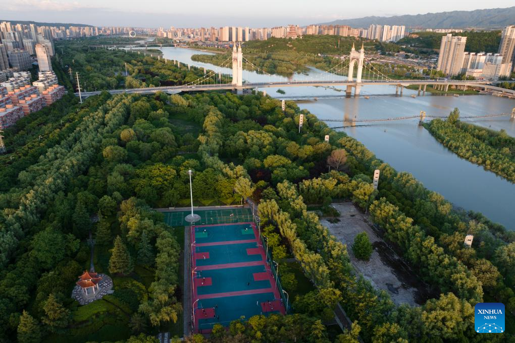 An aerial drone photo taken on May 9, 2024 shows an area for sports activities along the Weihe River in Baoji, northwest China's Shaanxi Province. Located at the foot of the Qinling Mountains and along the Weihe River, Baoji of northwest China's Shaanxi Province has continued to make efforts to create a livable urban environment. In recent years, a total of 36 small city parks have been built, providing citizens with activity space for leisure and sports, and improving the ecological environment of the city as well. (Xinhua/Shao Rui)