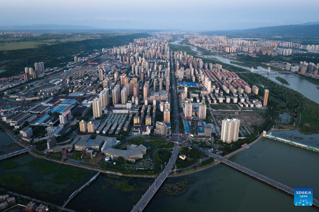 An aerial drone photo taken on May 9, 2024 shows a city view in Baoji, northwest China's Shaanxi Province. Located at the foot of the Qinling Mountains and along the Weihe River, Baoji of northwest China's Shaanxi Province has continued to make efforts to create a livable urban environment. In recent years, a total of 36 small city parks have been built, providing citizens with activity space for leisure and sports, and improving the ecological environment of the city as well. (Xinhua/Shao Rui)