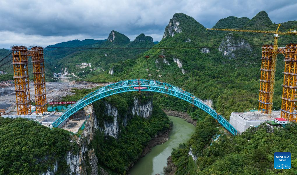 An aerial drone photo taken on May 10, 2024 shows the construction site of the Lami River bridge along the Guiyang-Pingtang expressway in southwest China's Guizhou Province. The bridge, with a total length of 206 meters, saw its arch ribs closed on Friday. (Xinhua/Tao Liang)