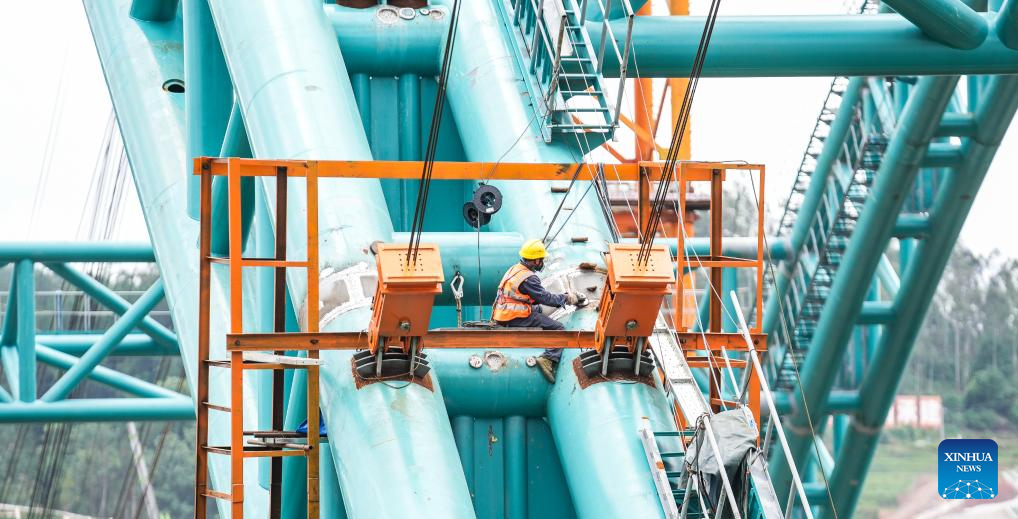 A worker works at the construction site of the Lami River bridge along the Guiyang-Pingtang expressway in southwest China's Guizhou Province, May 10, 2024. The bridge, with a total length of 206 meters, saw its arch ribs closed on Friday. (Xinhua/Tao Liang)