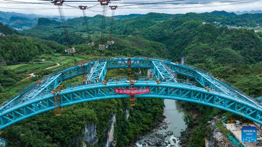 A drone photo taken on May 10, 2024 shows the construction site of the Lami River bridge along the Guiyang-Pingtang expressway in southwest China's Guizhou Province. The bridge, with a total length of 206 meters, saw its arch ribs closed on Friday. (Xinhua/Tao Liang)