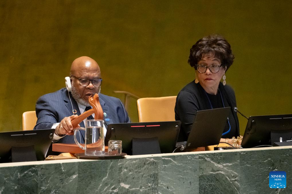 UN General Assembly President Dennis Francis (L) strikes his gavel to signal the adoption of a resolution during the 10th Emergency Special Session of the General Assembly at the UN headquarters in New York, on May 10, 2024. The UN General Assembly (UNGA) on Friday adopted a resolution supporting the Palestinian bid to become a full UN member by recognizing it as qualified to join and recommending that the Security Council "reconsider the matter favorably." (Manuel Elias/UN Photo/Handout via Xinhua)
