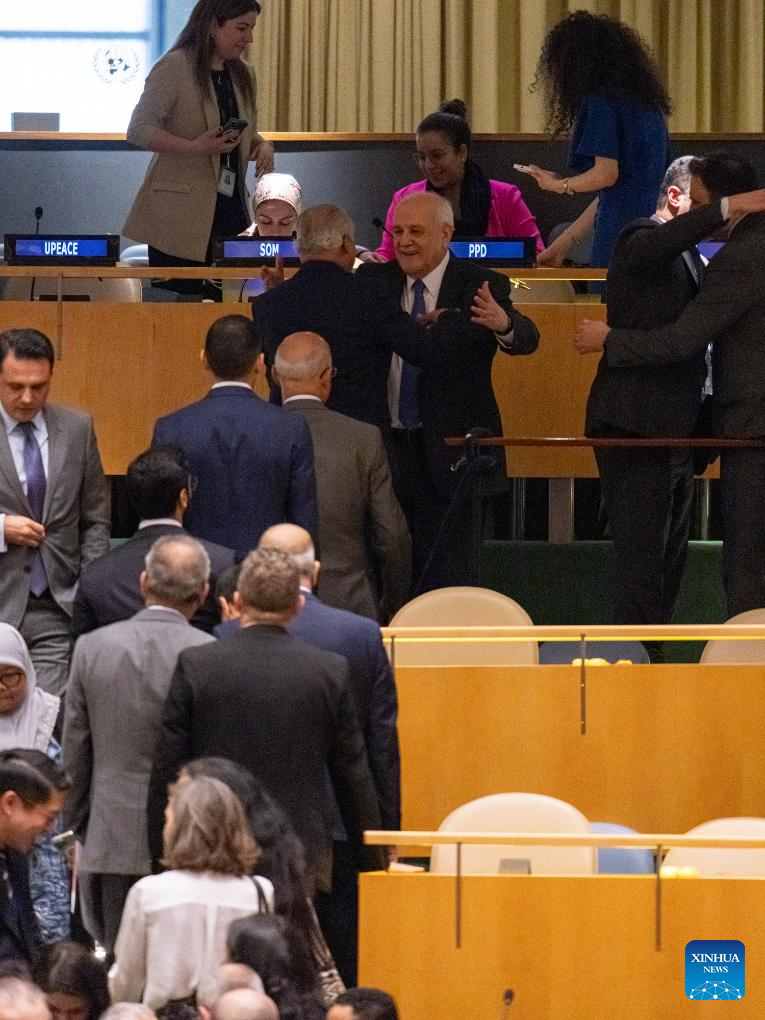 Riyad Mansour, the permanent observer of Palestine to the United Nations, is greeted after the General Assembly adopted a resolution at the UN headquarters in New York, on May 10, 2024. The UN General Assembly (UNGA) on Friday adopted a resolution supporting the Palestinian bid to become a full UN member by recognizing it as qualified to join and recommending that the Security Council "reconsider the matter favorably." (Manuel Elias/UN Photo/Handout via Xinhua)
