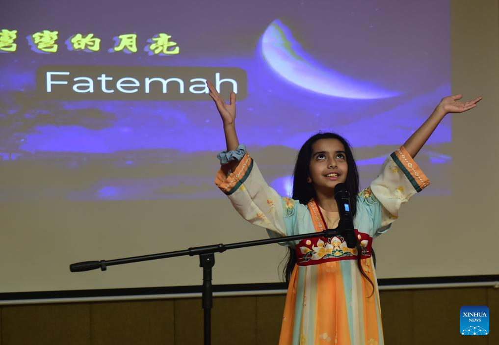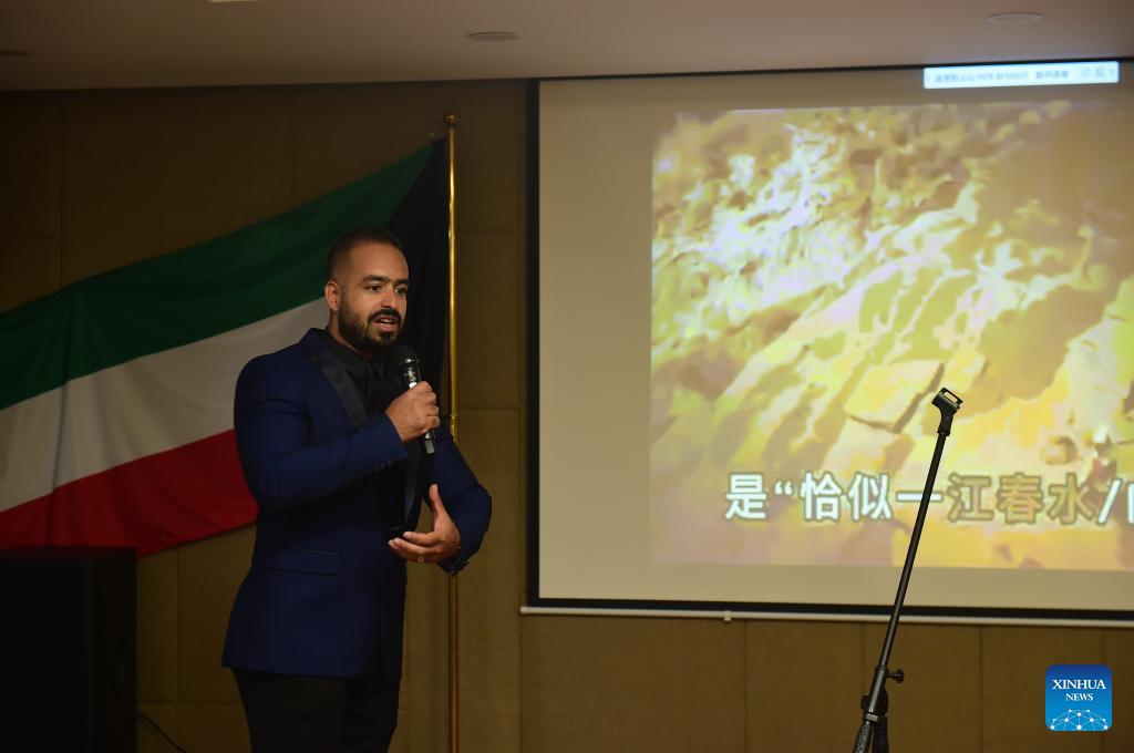 A participant takes part in a Chinese recitation contest at the China Cultural Center in Hawalli Governorate, Kuwait, May 9, 2024. (Photo by Liu Zhimin/Xinhua)