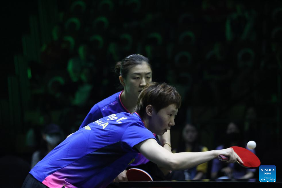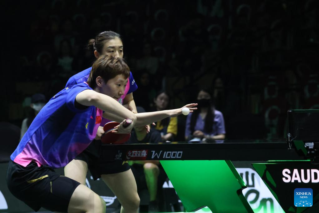 Wang Manyu/Chen Meng (R) of China compete against Jeon Jihee/Shin Yubin of South Korea during the women's doubles final at WTT Saudi Smash 2024 in Jeddah, Saudi Arabia, May 10, 2024. (Xinhua/Wang Haizhou)