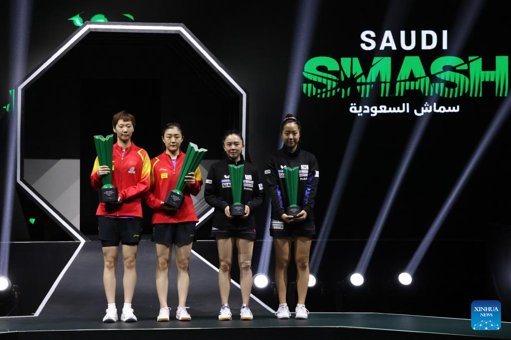 Wang Manyu (1st L)/Chen Meng (2nd L) of China and Jeon Jihee (2nd R)/Shin Yubin of South Korea react during the awarding ceremony after the women's doubles final at WTT Saudi Smash 2024 in Jeddah, Saudi Arabia, May 10, 2024. (Xinhua/Wang Haizhou)