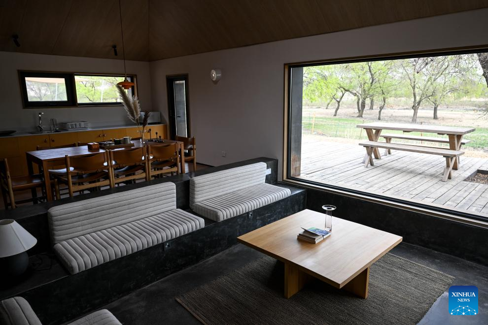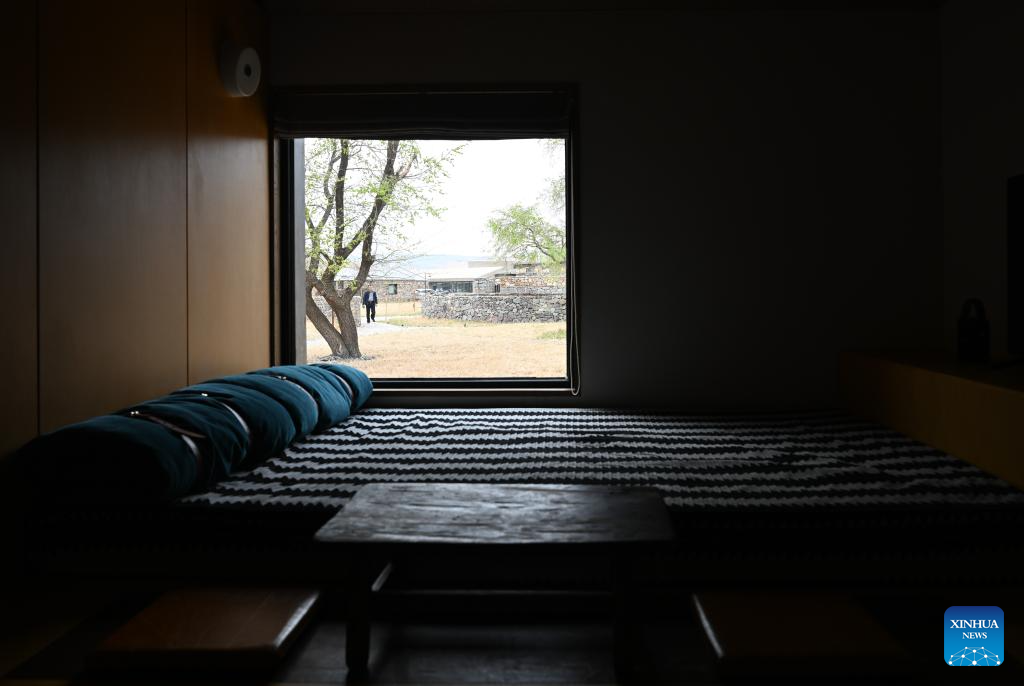 This photo taken on May 10, 2024 shows a room of a grassland homestay on the Ulan Mod grassland, located in Horqin Right Wing Front Banner, Hinggan League of north China's Inner Mongolia Autonomous Region. In recent years, a grassland homestay cluster in Hinggan League of north China's Inner Mongolia Autonomous Region, has become a new driving force for the high quality development of grassland tourism. The cluster concludes homestays, hotels, libraries, bakeries, cafes, art galleries and other facilities with modern and traditional elements, providing a place for tourists to relax and enjoy the scenery of the Ulan Mod grassland. (Xinhua/Bei He)