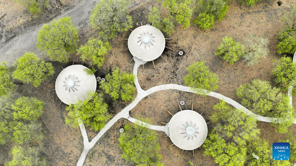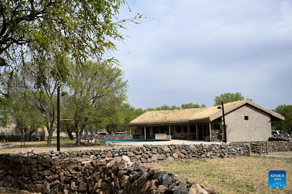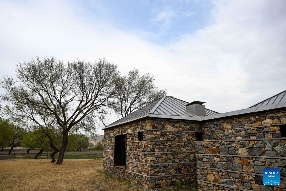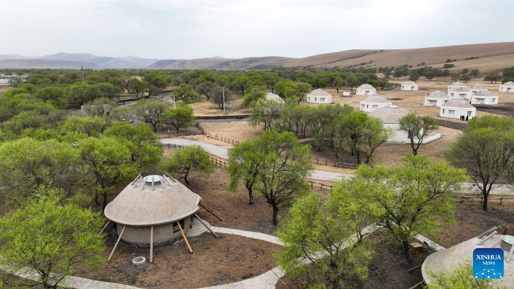 This photo taken on May 10, 2024 shows a grassland homestay on the Ulan Mod grassland, located in Horqin Right Wing Front Banner, Hinggan League of north China's Inner Mongolia Autonomous Region. In recent years, a grassland homestay cluster in Hinggan League of north China's Inner Mongolia Autonomous Region, has become a new driving force for the high quality development of grassland tourism. The cluster concludes homestays, hotels, libraries, bakeries, cafes, art galleries and other facilities with modern and traditional elements, providing a place for tourists to relax and enjoy the scenery of the Ulan Mod grassland. (Xinhua/Bei He)