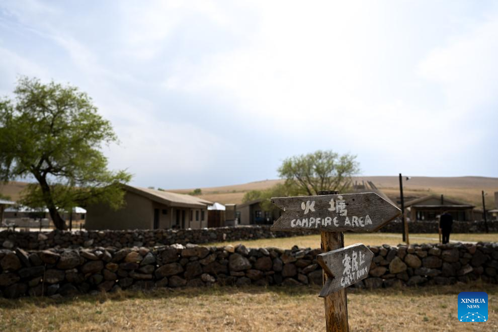 This photo taken on May 10, 2024 shows a grassland homestay sign on the Ulan Mod grassland, located in Horqin Right Wing Front Banner, Hinggan League of north China's Inner Mongolia Autonomous Region. In recent years, a grassland homestay cluster in Hinggan League of north China's Inner Mongolia Autonomous Region, has become a new driving force for the high quality development of grassland tourism. The cluster concludes homestays, hotels, libraries, bakeries, cafes, art galleries and other facilities with modern and traditional elements, providing a place for tourists to relax and enjoy the scenery of the Ulan Mod grassland. (Xinhua/Bei He)