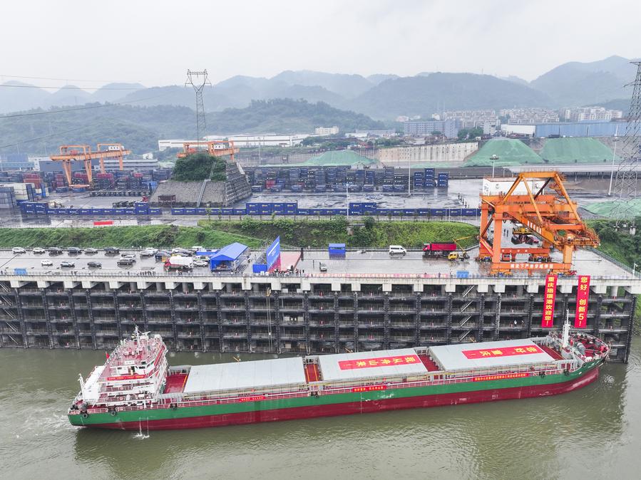 This photo taken on May 11, 2024 shows the Innovation 5 vessel about to arrive at Jiangjin Luohuang Port in southwest China's Chongqing. (Xinhua/Wang Quanchao)