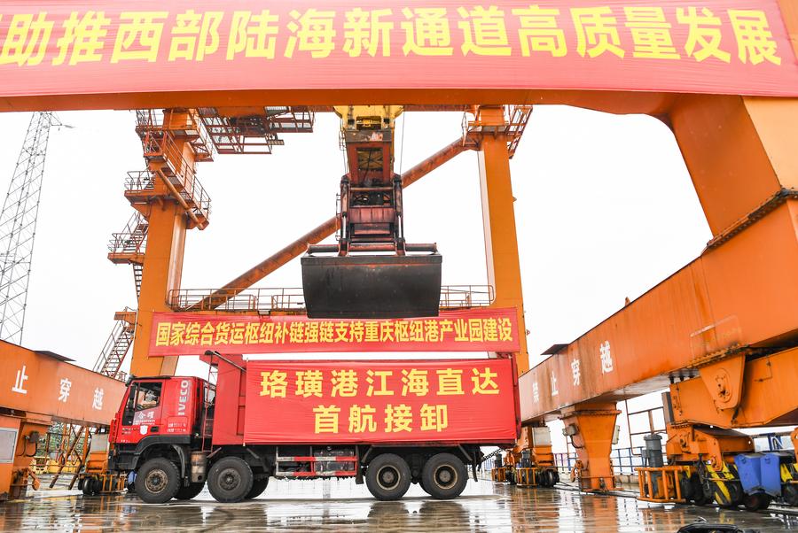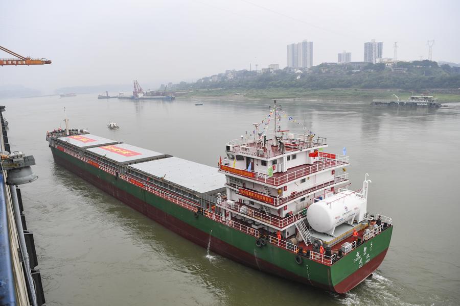 CHONGQING, May 12 (Xinhua) -- A 10,000-tonne-class sea-going vessel arrived in southwest China's Chongqing Municipality on Wednesday, becoming the first ship of its size to sail into the upper reaches of the Yangtze River. The Innovation 5, carrying over 5,000 tonnes of food, departed from Ningbo-Zhoushan Port in the eastern coastal province of Zhejiang on April 24. It traveled via the Chongqing-Zhoushan river-sea direct route, which links directly the municipality in the upper reaches of the Yangtze River with the sea.
