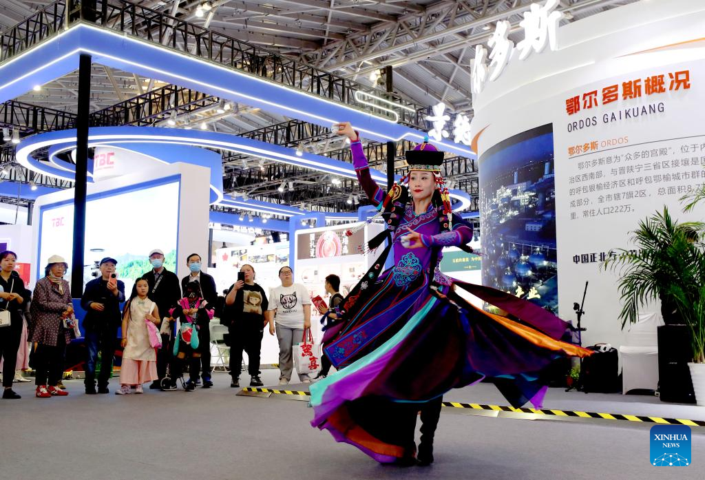 A dancer performs at the booth of Ordos of north China's Inner Mongolia Autonomous Region during a China brands exposition as part of the 2024 China Brand Day events in Shanghai, east China, May 12, 2024. (Xinhua/Fang Zhe)