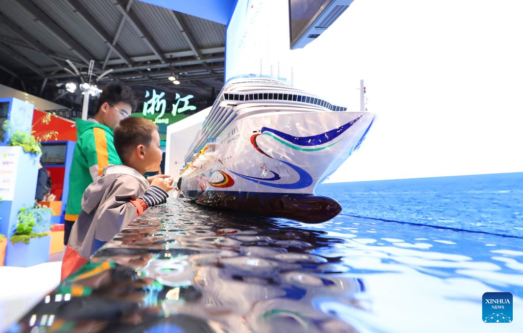 Visitors watch the model of a cruise ship at the booth of Shanghai during a China brands exposition as part of the 2024 China Brand Day events in Shanghai, east China, May 12, 2024. (Xinhua/Fang Zhe)