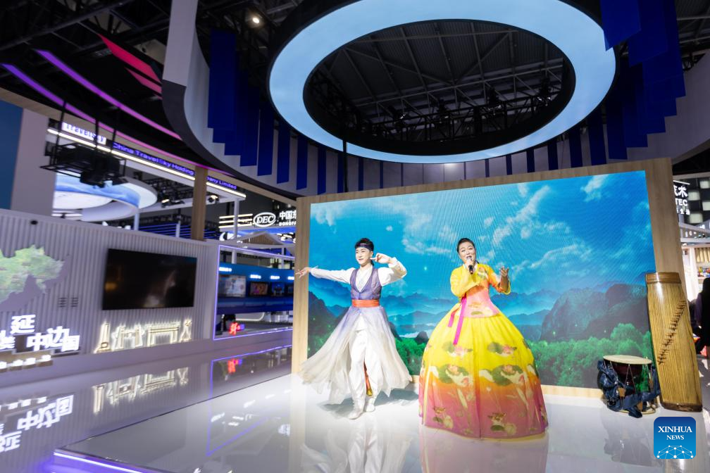 Artists stage a performance at the booth of Yanbian Korean Autonomous Prefecture of northeast China's Jilin Province during a China brands exposition as part of the 2024 China Brand Day events in Shanghai, east China, May 12, 2024. (Xinhua/Wang Xiang)?