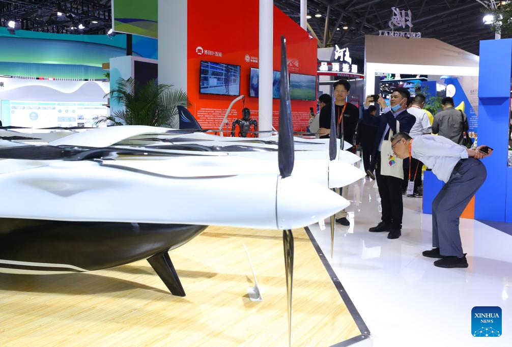 People watch a UAV model at the booth of Shanghai during a China brands exposition as part of the 2024 China Brand Day events in Shanghai, east China, May 12, 2024. (Xinhua/Fang Zhe)