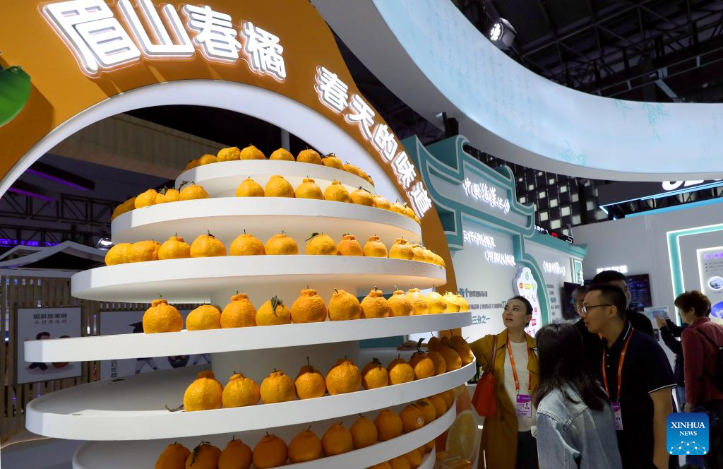 People watch tangerines on display at the booth of Meizhou City of southwest China's Sichuan Province during a China brands exposition as part of the 2024 China Brand Day events in Shanghai, east China, May 12, 2024. (Xinhua/Fang Zhe)