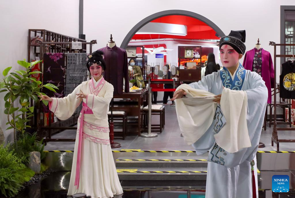 Kunqu opera performers stage a play at the booth of Suzhou City of east China's Jiangsu Province during a China brands exposition as part of the 2024 China Brand Day events in Shanghai, east China, May 11, 2024. (Xinhua/Fang Zhe)