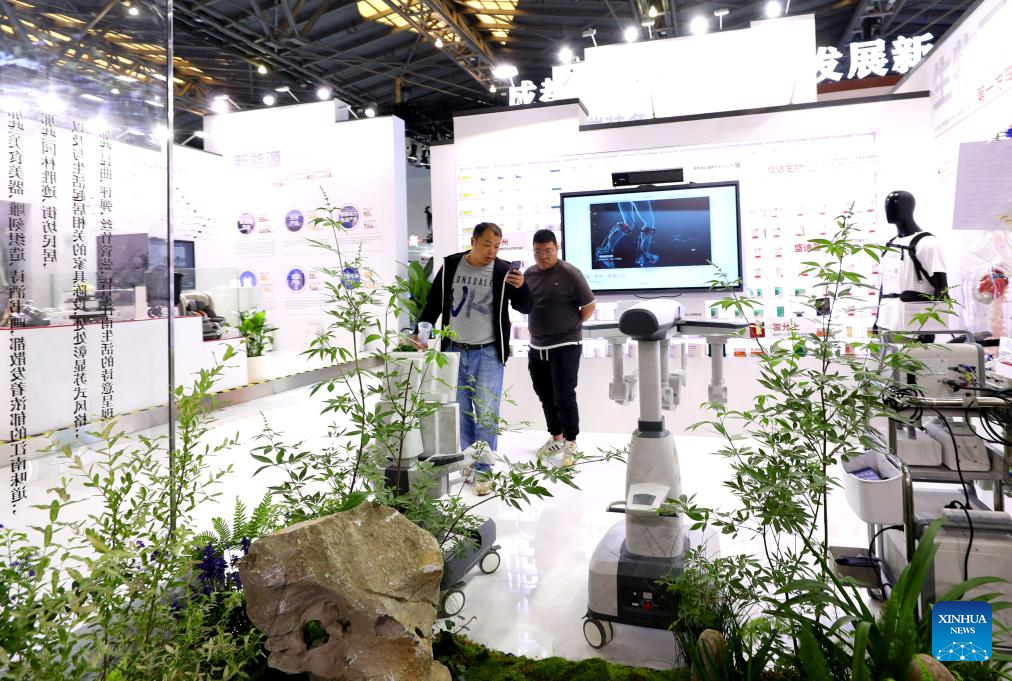 People watch the medical robots on display at the booth of Suzhou City of east China's Jiangsu Province during a China brands exposition as part of the 2024 China Brand Day events in Shanghai, east China, May 12, 2024. (Xinhua/Fang Zhe)