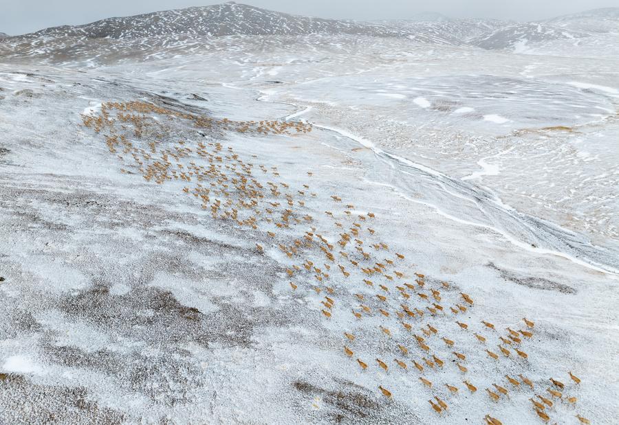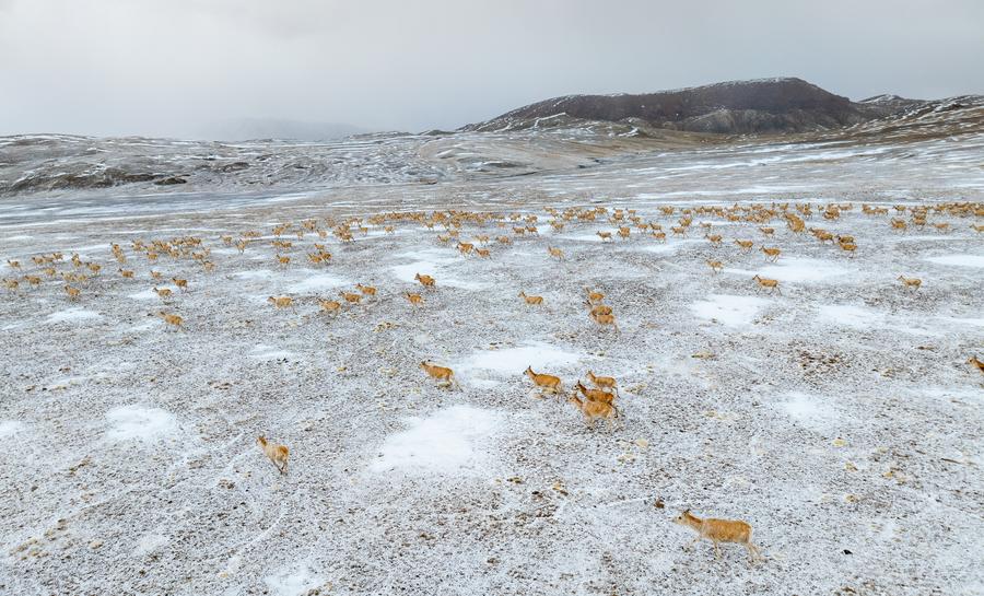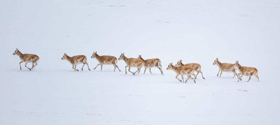 Tibetan antelopes gallop in the snowfield at the Qiangtang National Nature Reserve in the northern part of southwest China's Xizang Autonomous Region, May 8, 2024. (Xinhua/Jiang Fan)