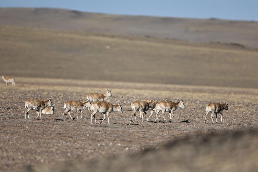 Tibetan antelopes walk over the top of a hill at the Qiangtang National Nature Reserve in the northern part of southwest China's Xizang Autonomous Region, May 10, 2024. (Xinhua/Jiang Fan)