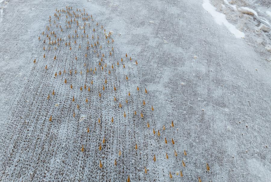 An aerial drone photo taken on May 10, 2024 shows pregnant Tibetan antelopes migrating to their habitual birth grounds at the Qiangtang National Nature Reserve in the northern part of southwest China's Xizang Autonomous Region. (Xinhua/Jiang Fan)