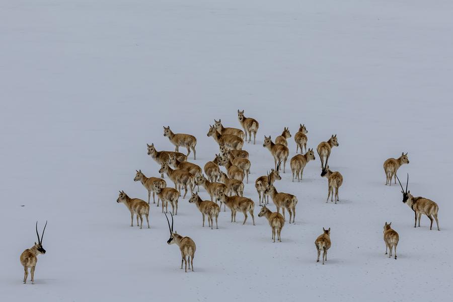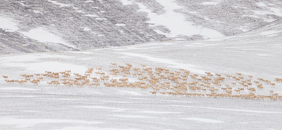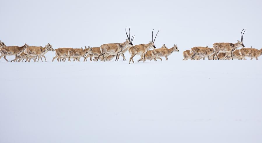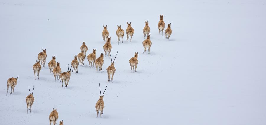 Tibetan antelopes gallop in the snowfield at the Qiangtang National Nature Reserve in the northern part of southwest China's Xizang Autonomous Region, May 8, 2024. (Xinhua/Tenzin Nyida)