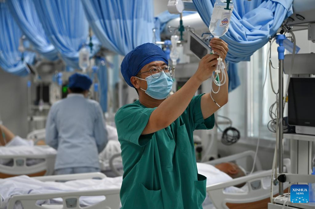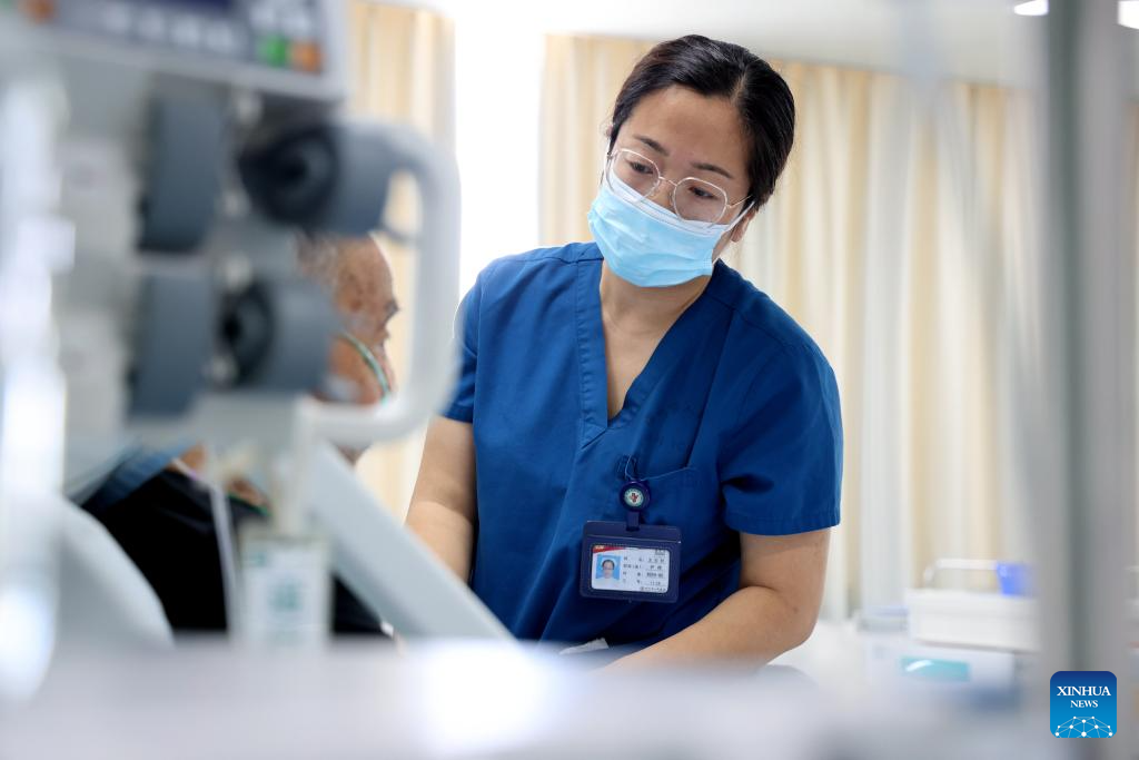 A nurse takes care of a patient at the emergency department of a hospital in Shijiazhuang, north China's Hebei Province, May 12, 2024. Sunday marked the 113th International Nurses Day. (Photo by Zhang Xiaofeng/Xinhua)