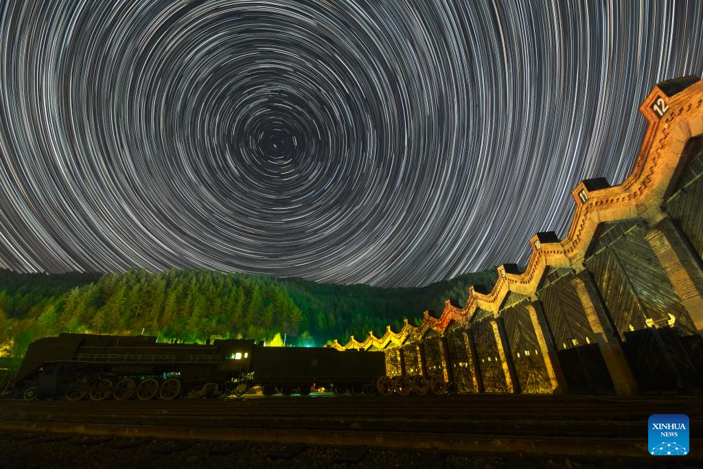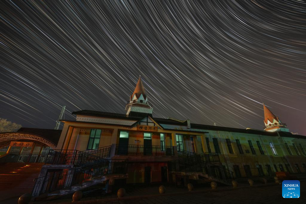 This stacked photo taken on April 13, 2024 shows the Chinese Eastern Railway museum under the starry sky in Hengdaohezi Town of Hailin City, northeast China's Heilongjiang Province. Dubbed "a town pulled by trains," Hengdaohezi, located in the city of Hailin in northeast China's Heilongjiang Province, was originally established in the late 19th century when Russians built train maintenance workshops and other facilities there following the construction of the Chinese Eastern Railway. Due to well-preserved historic buildings, the exotic town now has become a popular tourist destination. (Photo by Wang Baoxun/Xinhua)