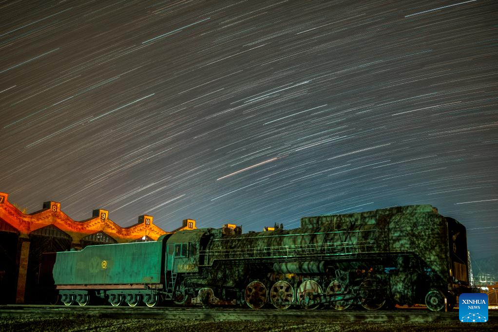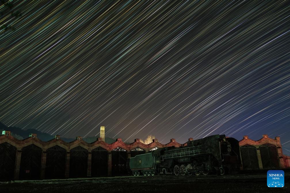 This stacked photo taken on April 14, 2024 shows the railway station of Hengdaohezi under the starry sky in Hailin City, northeast China's Heilongjiang Province. Dubbed "a town pulled by trains," Hengdaohezi, located in the city of Hailin in northeast China's Heilongjiang Province, was originally established in the late 19th century when Russians built train maintenance workshops and other facilities there following the construction of the Chinese Eastern Railway. Due to well-preserved historic buildings, the exotic town now has become a popular tourist destination. (Photo by Wang Baoxun/Xinhua)