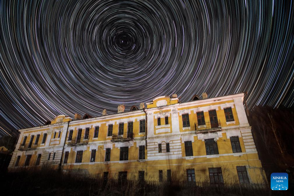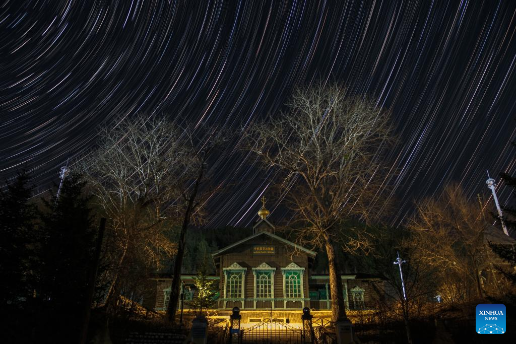 This stacked photo taken on April 4, 2024 shows a Russian-style building under the starry sky in Hengdaohezi Town of Hailin City, northeast China's Heilongjiang Province. Dubbed "a town pulled by trains," Hengdaohezi, located in the city of Hailin in northeast China's Heilongjiang Province, was originally established in the late 19th century when Russians built train maintenance workshops and other facilities there following the construction of the Chinese Eastern Railway. Due to well-preserved historic buildings, the exotic town now has become a popular tourist destination. (Photo by Wang Baoxun/Xinhua)