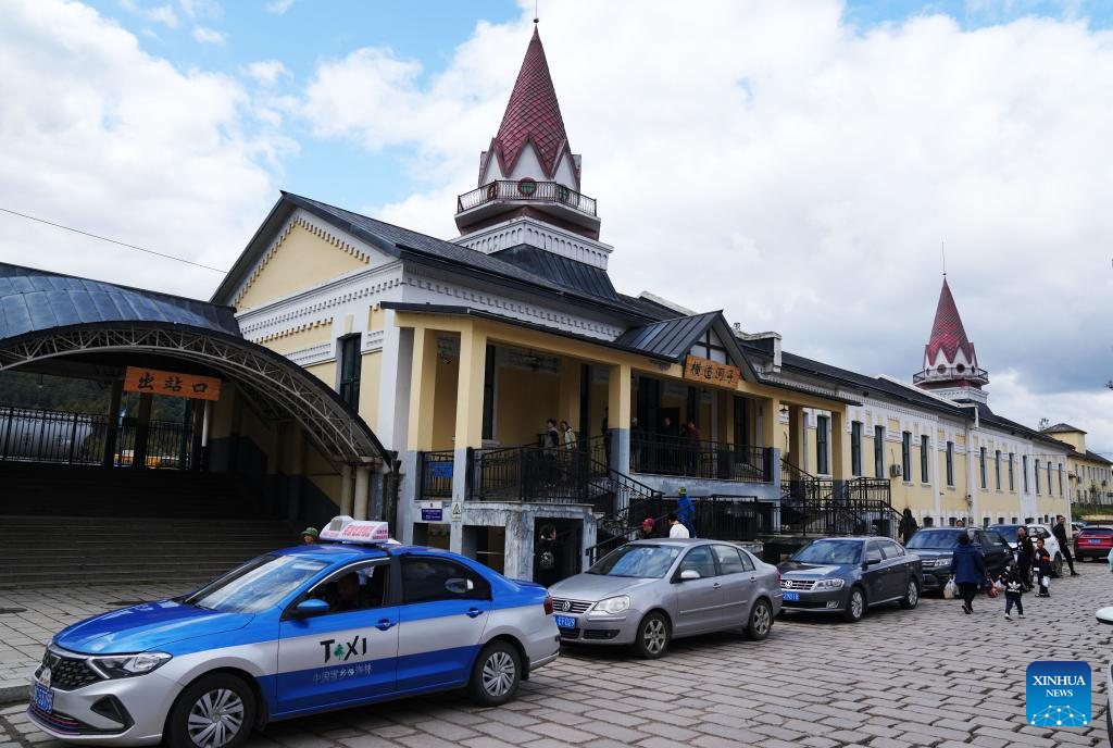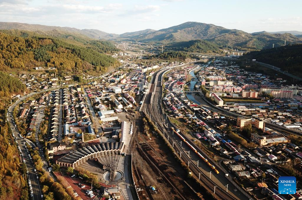 This photo taken on Sept. 30, 2023 shows the railway station of Hengdaohezi in Hailin City, northeast China's Heilongjiang Province. Dubbed "a town pulled by trains," Hengdaohezi, located in the city of Hailin in northeast China's Heilongjiang Province, was originally established in the late 19th century when Russians built train maintenance workshops and other facilities there following the construction of the Chinese Eastern Railway. Due to well-preserved historic buildings, the exotic town now has become a popular tourist destination. (Xinhua/Wang Jianwei)