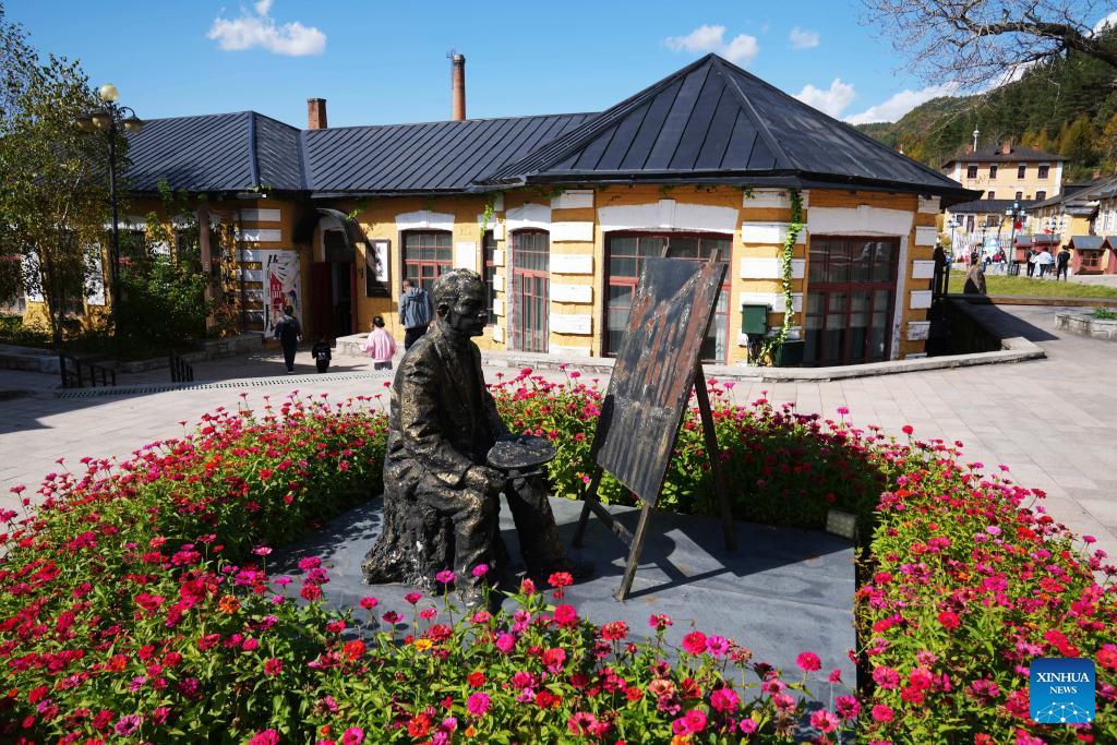 This photo taken on Oct. 2, 2023 shows a view at an oil painting themed village of Hengdaohezi Town of Hailin City, northeast China's Heilongjiang Province. Dubbed "a town pulled by trains," Hengdaohezi, located in the city of Hailin in northeast China's Heilongjiang Province, was originally established in the late 19th century when Russians built train maintenance workshops and other facilities there following the construction of the Chinese Eastern Railway. Due to well-preserved historic buildings, the exotic town now has become a popular tourist destination. (Xinhua/Wang Jianwei)