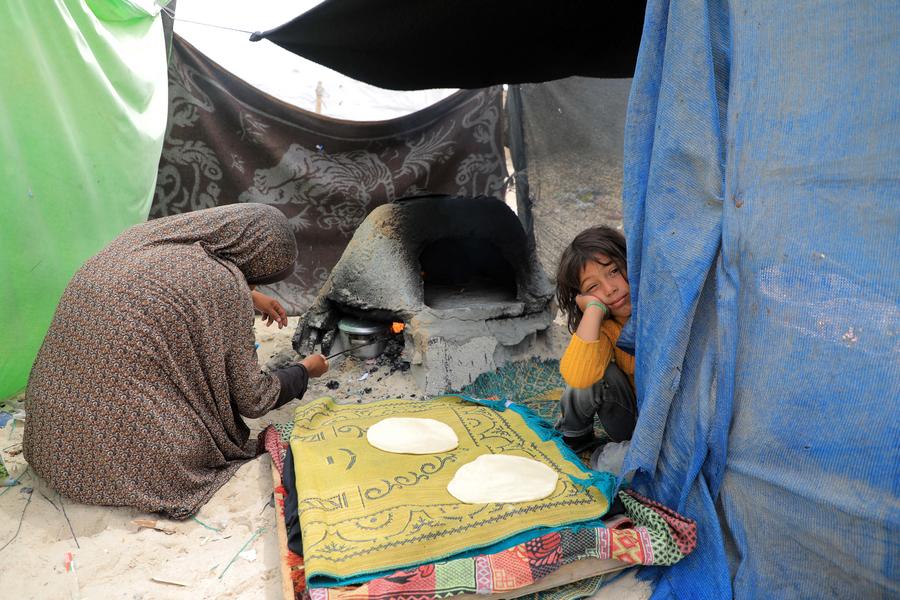 A Palestinian woman evacuated from Rafah prepares food at a beach in the southern Gaza Strip city of Khan Younis, on May 10, 2024. (Photo by Rizek Abdeljawad/Xinhua)