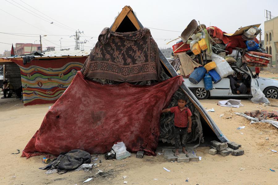 A Palestinian boy stands outside a tent at a temporary camp in the southern Gaza Strip city of Rafah, on May 10, 2024. (Photo by Rizek Abdeljawad/Xinhua)