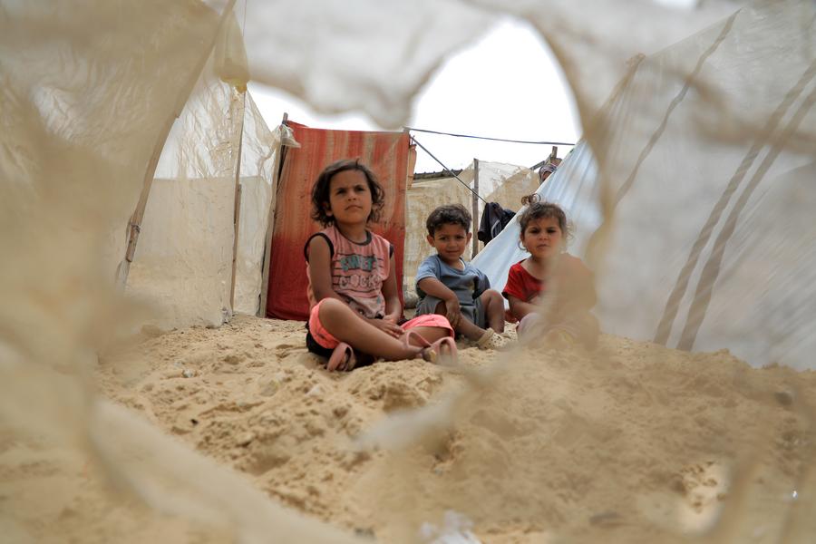 Palestinian children evacuated from Rafah are seen on a beach in the southern Gaza Strip city of Khan Younis, on May 10, 2024. (Photo by Rizek Abdeljawad/Xinhua)