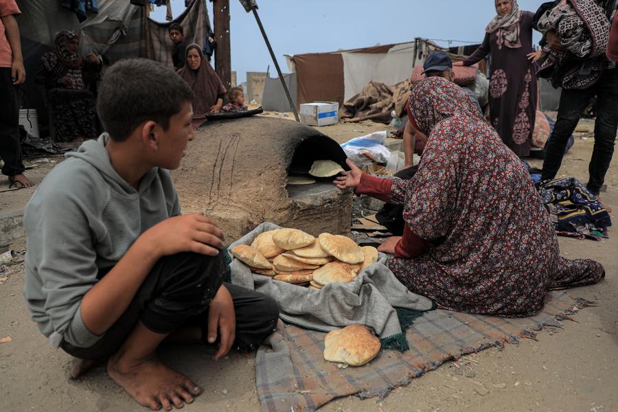 A Palestinian woman makes bread at a temporary camp in the southern Gaza Strip city of Rafah, on May 10, 2024. (Photo by Rizek Abdeljawad/Xinhua)