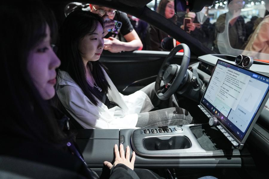 Visitors experience Xiaomi's new energy vehicle model SU7 at the 2024 Beijing International Automotive Exhibition in Beijing, China, April 28, 2024. (Xinhua/Peng Ziyang)
