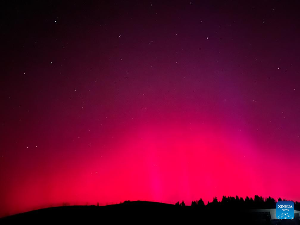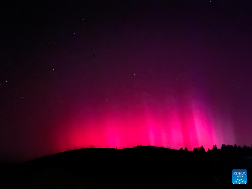This photo taken with a mobile phone on May 11, 2024 shows the northern lights near Nanshan scenic spot in Urumqi, capital of northwest China's Xinjiang Uygur Autonomous Region. (Xinhua/Chen Shuo)
