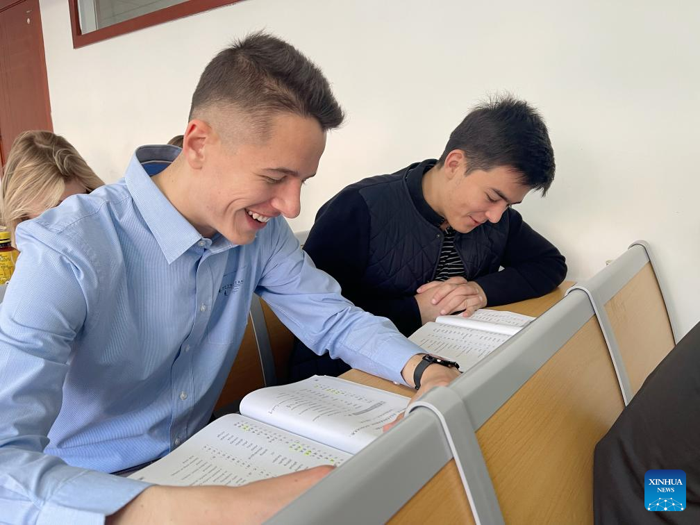 Markos Milan (L), a student from Hungary, learns Chinese at Tianjin University in north China's Tianjin Municipality on Oct. 31, 2023. (Xinhua)