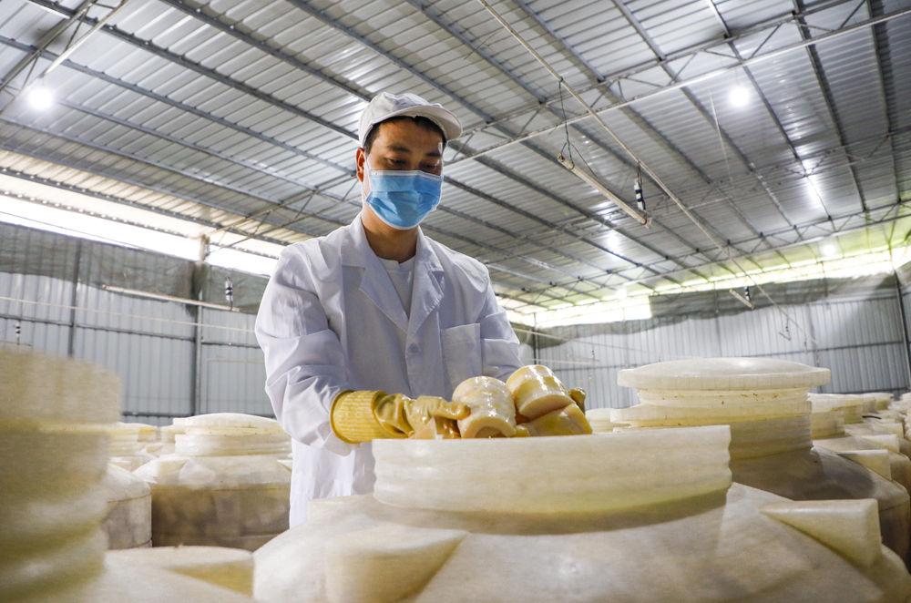 A worker makes pickled bamboo shoots, an ingredient of Luosifen. (Photo/Xinhua)