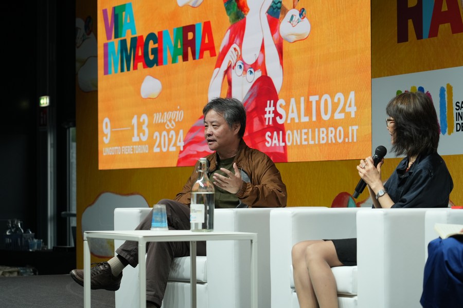 Chinese writer Yu Hua (L) speaks at a signing session during the Turin International Book Fair in Turin, Italy, May 12, 2024. (Xinhua/Ren Yaoting)