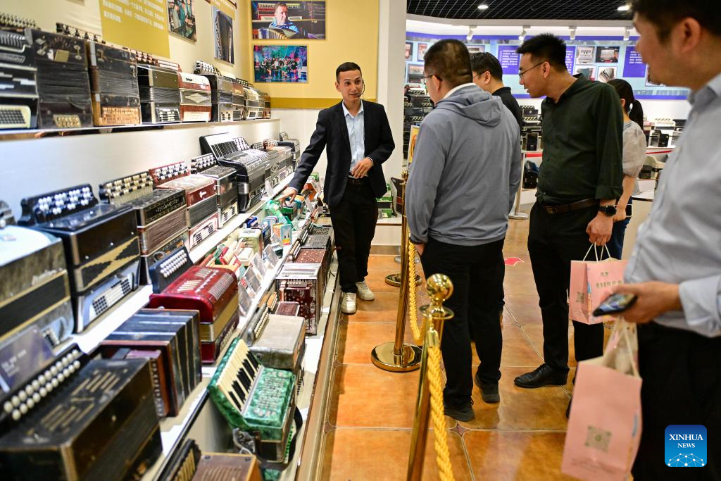 Tourists visit the Alexander accordion collection hall on the Liuxing Street in Yining City, Ili Kazak Autonomous Prefecture, northwest China's Xinjiang Uygur Autonomous Region, May 11, 2024. (Xinhua/Ding Lei)